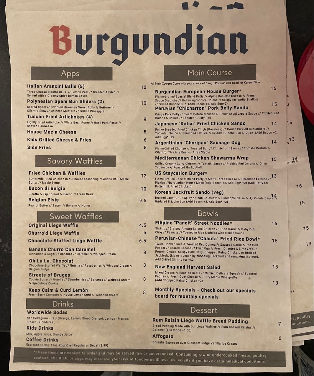 Burgundian, located at 55 Park St in Attleboro, MA, unveils an enticing menu that marries global flavors with comforting favorites. Highlights of their offerings include the Large Parisian Salad, a vibrant medley of fresh greens, pickled red onions, and crispy shallots, expertly dressed with a fresh lemon vinaigrette, priced at just $12. For a heartier option, the Spaetzel Mac & Cheese features house-made German noodles, smoked gouda, and dijon béchamel, with protein upgrades like shrimp or carne asada steak for an extra touch of indulgence, all for $16.